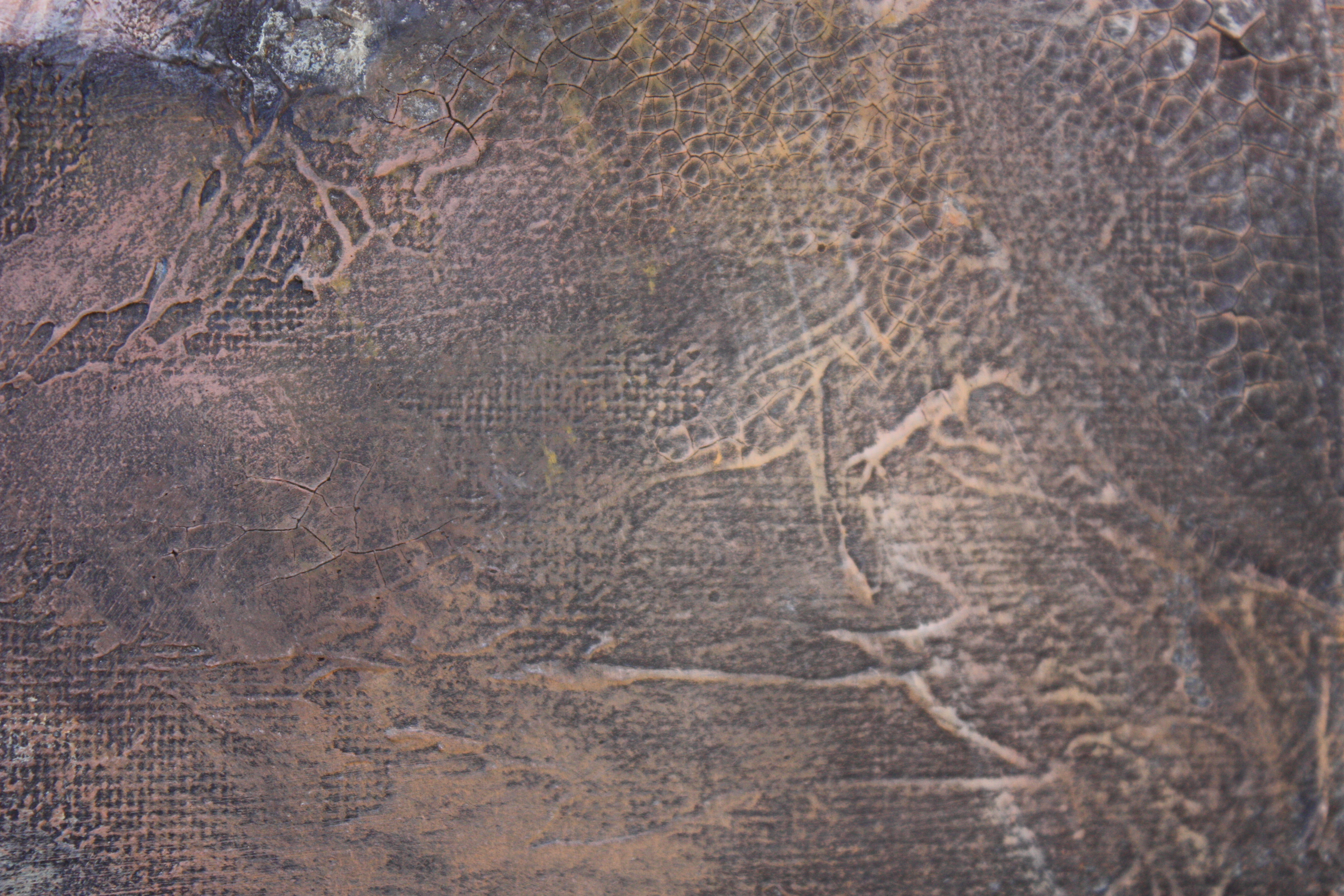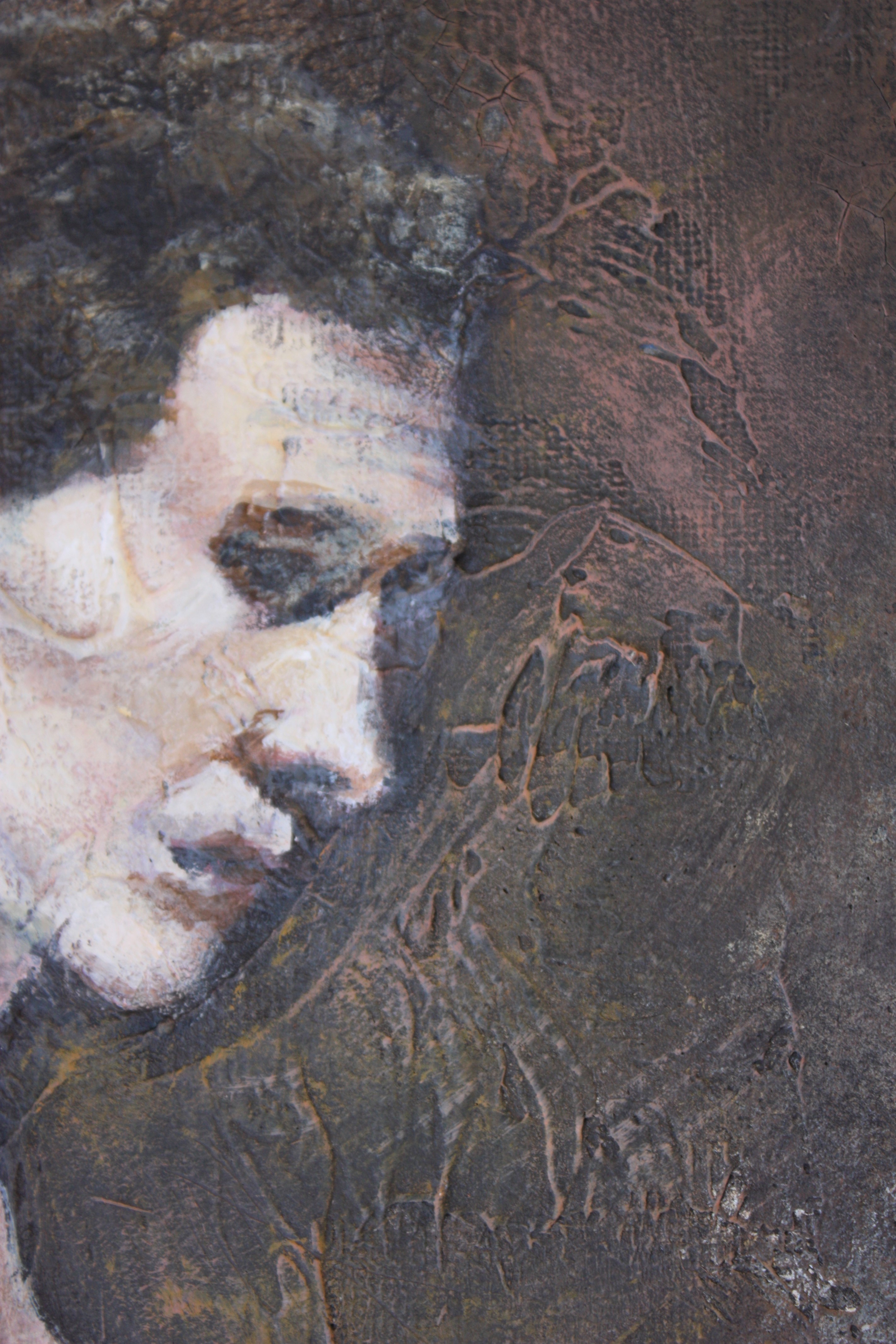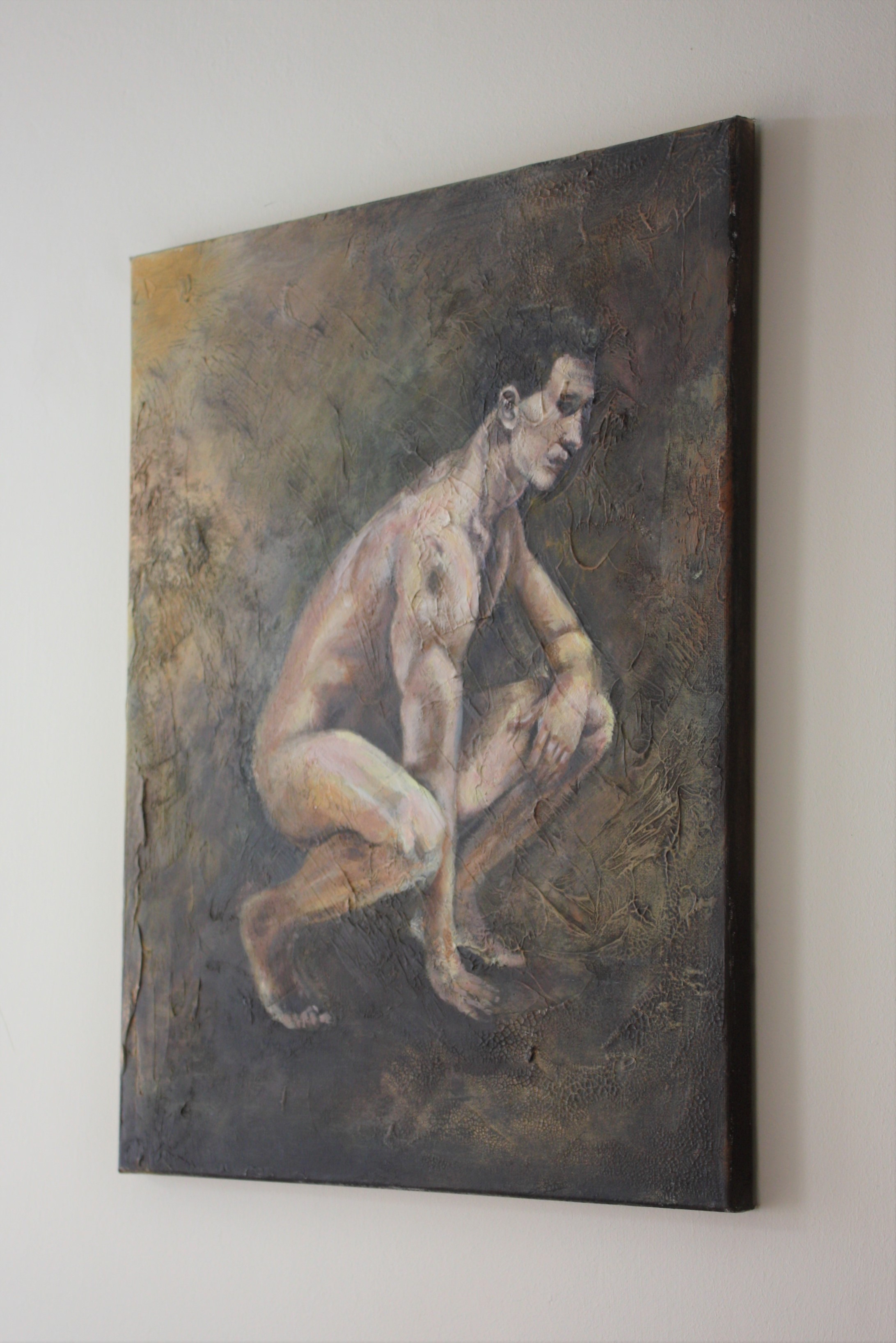 Mixed media painting of a crouching male figure on canvas. I have used a variety of materials in this paintings to achieve a highly textured and unique foundation. The surface was then painted using acrylic paint.